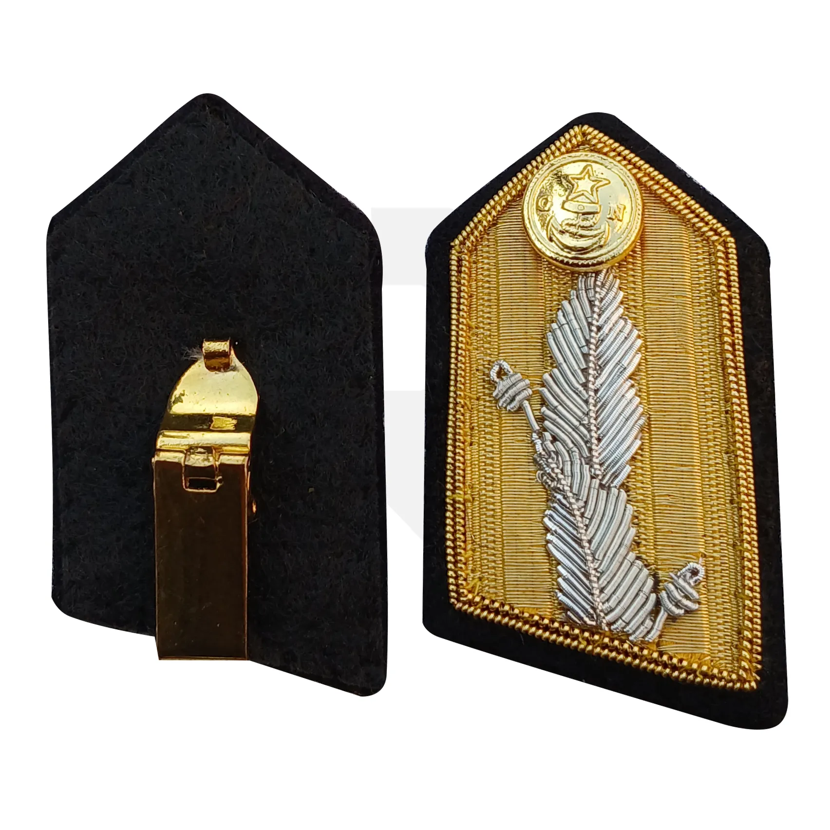 A Gorget Collar is a decorative military and ceremonial neck ornament historically derived from armor worn by officers. Traditionally used as a symbol of rank and authority, the gorget collar is now worn as part of ceremonial, parade, or historical uniforms. It adds a distinguished and formal appearance, making it ideal for reenactments, honor guards, and official dress uniforms.